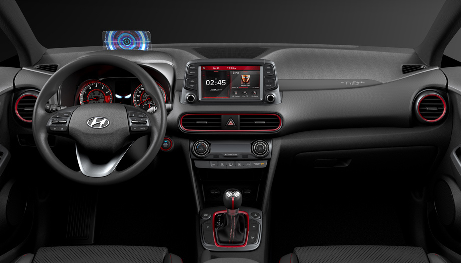 Узкая передняя оптика Коны в сочетании с шестиугольной решёткой, у которой слегка изогнуты боковые грани, даже в стандартном виде вызывает ассоциации со шлемом Железного человека и его «глазами». А в специальном издании разработчики постарались усилить этот эффект за счёт уникальных ходовых огней, а также красных акцентов и чуть перекроенного бампера. Решётка же окрашена в тёмный хром.