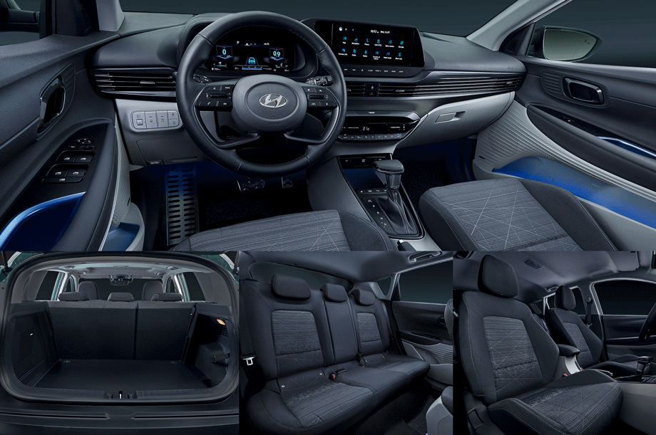 Для Байона предусмотрено девять цветов кузова, включая белый, серебристый, серый, синий, красный и новый зелёный Mangrove Green, а также опциональная двухцветная окраска с чёрной крышей. Салон может быть чёрным, тёмно- или светло-серым, с контрастными вставками и прострочкой. Медиацентр Hyundai Bluelink без проводов поддерживает Apple CarPlay и Android Auto, предлагает «облачную» навигацию, распознаёт голосовые команды, синхронизируется с календарём в Гугле и так далее. За безопасность отвечают 15 систем, входящих комплекс Hyundai SmartSense, к примеру, работают автоторможение и полуавтономная парковка.