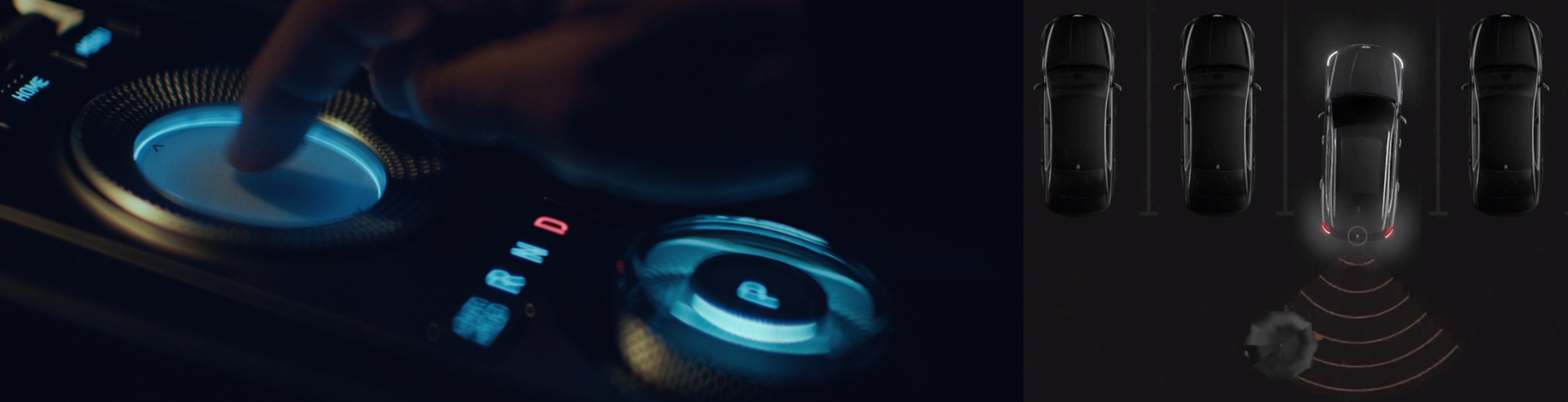 Селектор трансмиссии сделан вращающимся, а рядом расположилось колечко для управления мультимедийной системой с подсвечиваемым тачпадом, распознающим рукописный ввод. Справа: при выезде с парковки сенсоры предупредят о наличии пешеходов или других машин.