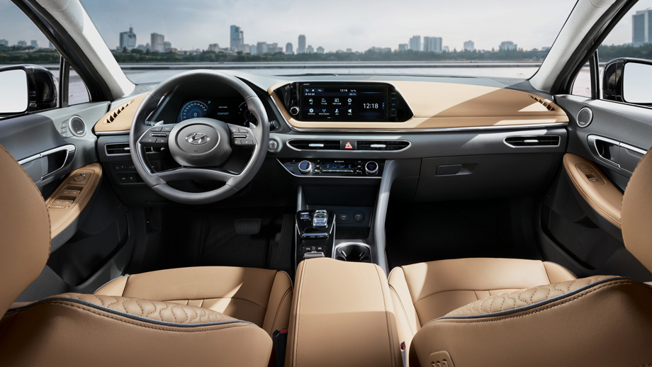 Приборную панель разработчики называют «крылом самолёта-невидимки», и такими же парящими сделаны подлокотники. Вся ключевая информация выводится на два экрана в центре, соединённых бесшовно (в сумме они составляют 10,25 дюйма) и управляемых сенсорными кнопками. Ради высвобождения большего пространства на тоннеле управление трансмиссией сделано кнопочным. Ещё компания рассказала, что в новой Сонате телефон с технологией NFC можно использовать в качестве ключа, если установить соответствующее приложение.