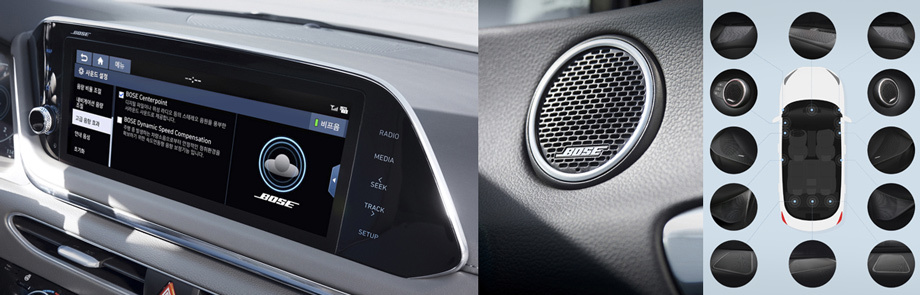 Впервые фирма Hyundai сотрудничает с производителем премиальных аудиосистем Bose. В новой Сонате (в зависимости от комплектации) можно увидеть аудиокомплекс этой марки с 12 динамиками (на предшествующем седане было максимум восемь).