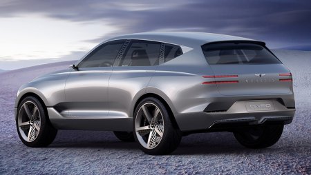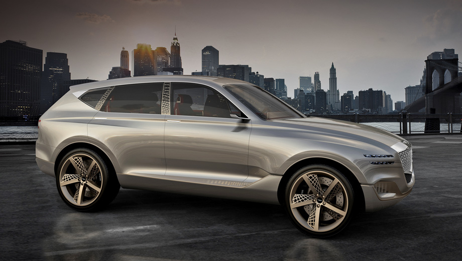 Это будет первый кроссовер премиум-сегмента в истории корейского автопрома. А ещё перед нами дебютная работа Люка Донкервольке на посту шеф-дизайнера бренда. Атлетичный силуэт хорош без оговорок, а «двухэтажные» фары и фонари похожи на элементы инопланетного происхождения. Как признался в интервью американским журналистам глава Дженезиса Манфред Фитцджеральд, такая оптика вместе с подобной трапециевидной решёткой радиатора станут визитной карточкой серийных автомобилей Genesis. Хотя 23-дюймовые колёса с перфорированными спицами, полупрозрачные боковые стойки и мизерные зеркала заднего вида до конвейера не доживут.