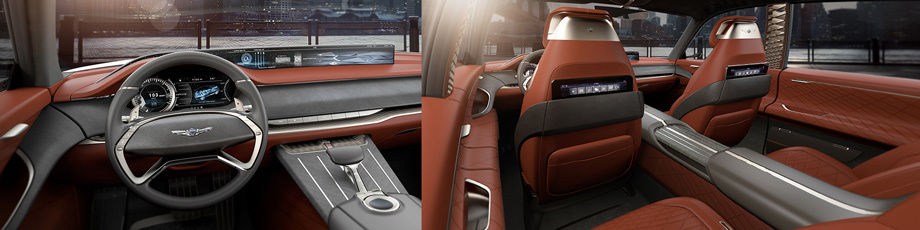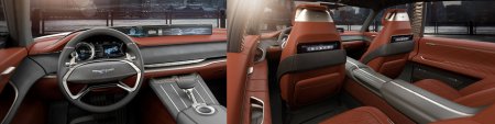 Интерьер приближен к реальности больше, чем экстерьер. Салон отделан привычными нам натуральной кожей, искусственной замшей, настоящим деревом и алюминием. Перед глазами водителя расположилась виртуальная панель приборов, а под правой ладонью ― сенсорная шайба-контроллер мультимедийной системы с тремя отдельными клавишами. Самый необычный элемент ― широкоформатный дисплей диагональю 22 дюйма. А что касается техники, то Genesis GV80 ― концепт на водородных топливных элементах, чьи аккумуляторы можно заряжать от розетки. Но в серию пойдут версии с бензиновым наддувным V6 и с четырёхцилиндровым турбодизелем, разработка которого уже ведётся.