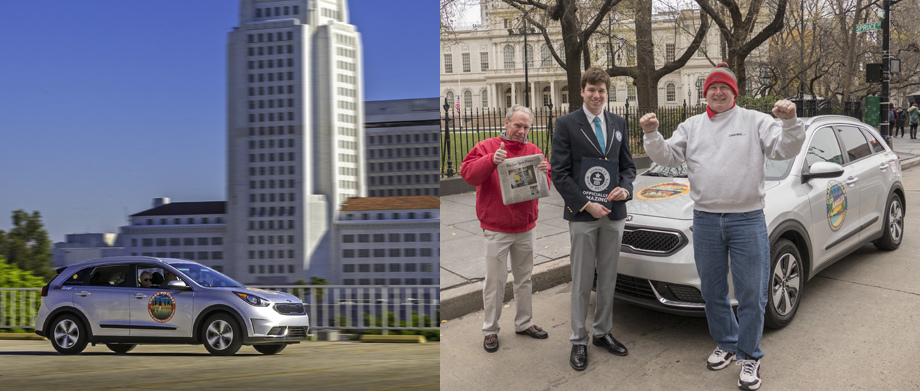 Вчера, 15 декабря, компания KIA рассказала об установлении рекорда Гиннесса: стандартный паркетник Niro стал самым экономичным гибридом, пересекшим США от океана до океана. Уэйн Гердес из Калифорнии и Роберт Уингер из Вирджинии проехали 3715,4 мили (5979 км) от сити-холла Лос-Анджелеса до мэрии в Нью-Йорке, затратив 48,5 галлона топлива (183,6 л), или 3,07 л/100 км.