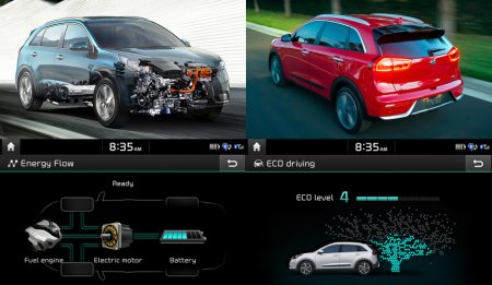 В экономии топлива водителю Niro поможет не только мотор 1.6 с непосредственным впрыском, работающий по циклу Аткинсона, литиевый аккумулятор и электропривод, но и вспомогательная графика на дисплее: плавное движение «выращивает» зелёное деревце.