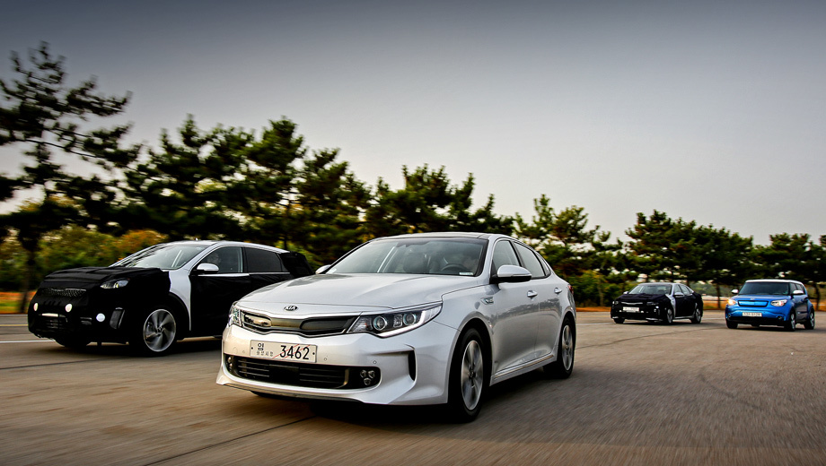 Так сегодня выглядит «зелёная» линейка KIA. Слева направо: паркетник с предполагаемым именем Niro, гибридная Optima, седан Cadenza (?), Soul. Через пять лет экологичных моделей будет одиннадцать.