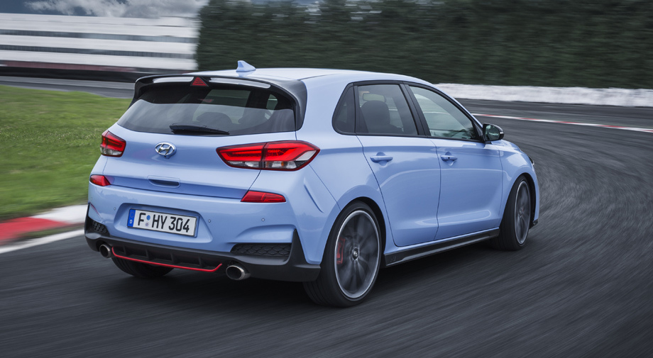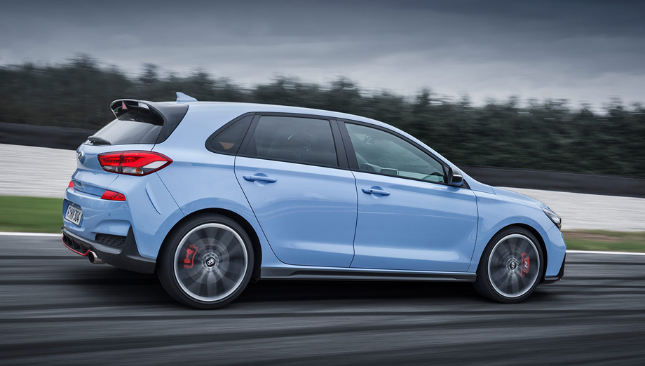 Развёрнутые по горизонтали диодные огни, более крупные воздухозаборники и сплиттер с красной полосой позволяют сходу отличить «горячий» i30 от простого. Основной цвет Performance Blue подсмотрен у гоночных Hyundai.