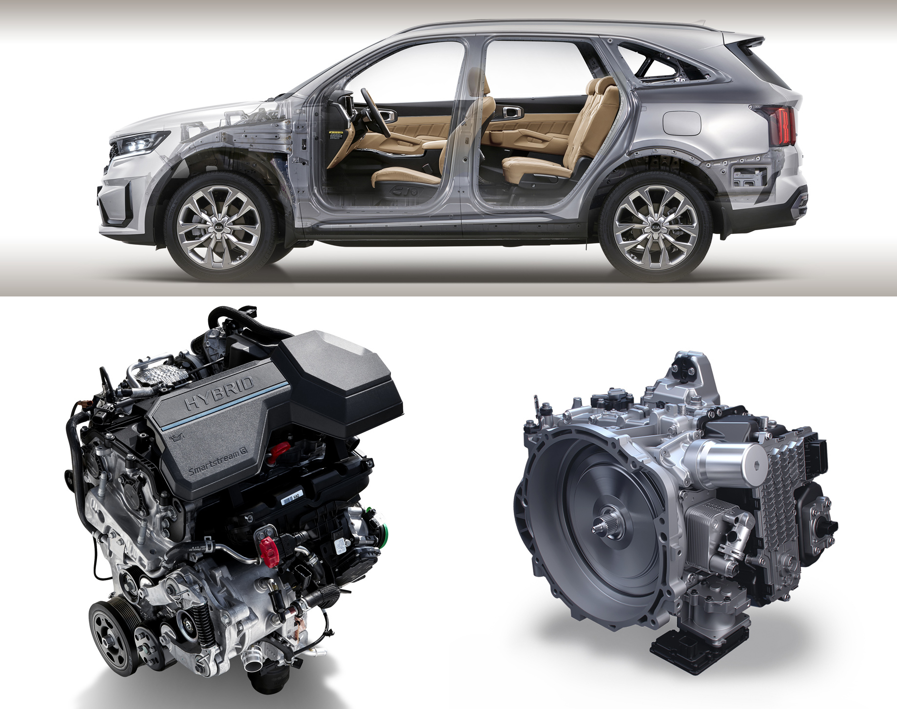 Сериал под названием «Раскрытие Kia Sorento» продолжился обнародованием перечня силовых агрегатов. Первым заявлен простой гибрид на базе турбомотора с непосредственным впрыском 1.6 T-GDi, дополненного электромотором мощностью 44,2 кВт и тяговой литиево-ионной батареей ёмкостью 1,49 кВт•ч, расположившейся под полом так, чтобы не помешать багажнику и салону. Комбинированная отдача системы составила 230 л.с. и 350 Н•м. Такая модификация будет продаваться в Южной Корее, Европе и Северной Америке.