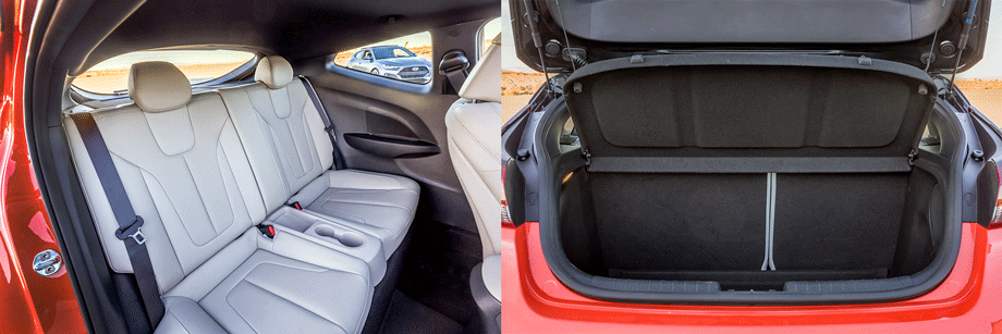 Как и раньше, Veloster ― четырёхместный автомобиль. Но над головами пассажиров второго ряда теперь находится не стекло двери багажника, а потолок. Общий объём салона ― 3087 л (было 2973 л). Обивка сидений может быть тканевой, комбинированной и кожаной. Заднее сиденье складывается в соотношении 60:40. Объём багажника ― 564 л (вместо 424 л).