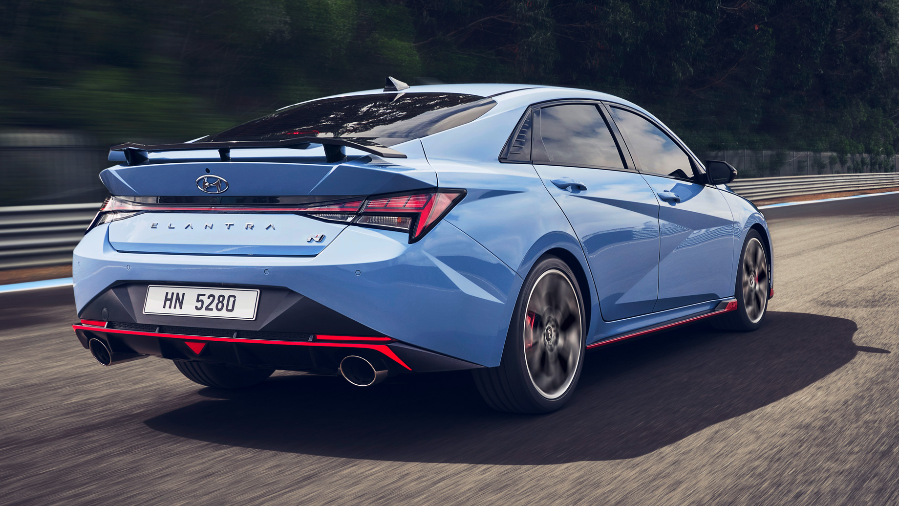 Лицо Элантры N (4675×1825×1415 мм, между осей 2720) стилизовано под гоночный шлем за счёт новых решётки и бампера. Сплиттер и боковые юбки объединены красной полосой N-exclusive. Фиксированный спойлер на крышке багажника вместе с задним диффузором «помогают управлять воздушным потоком».