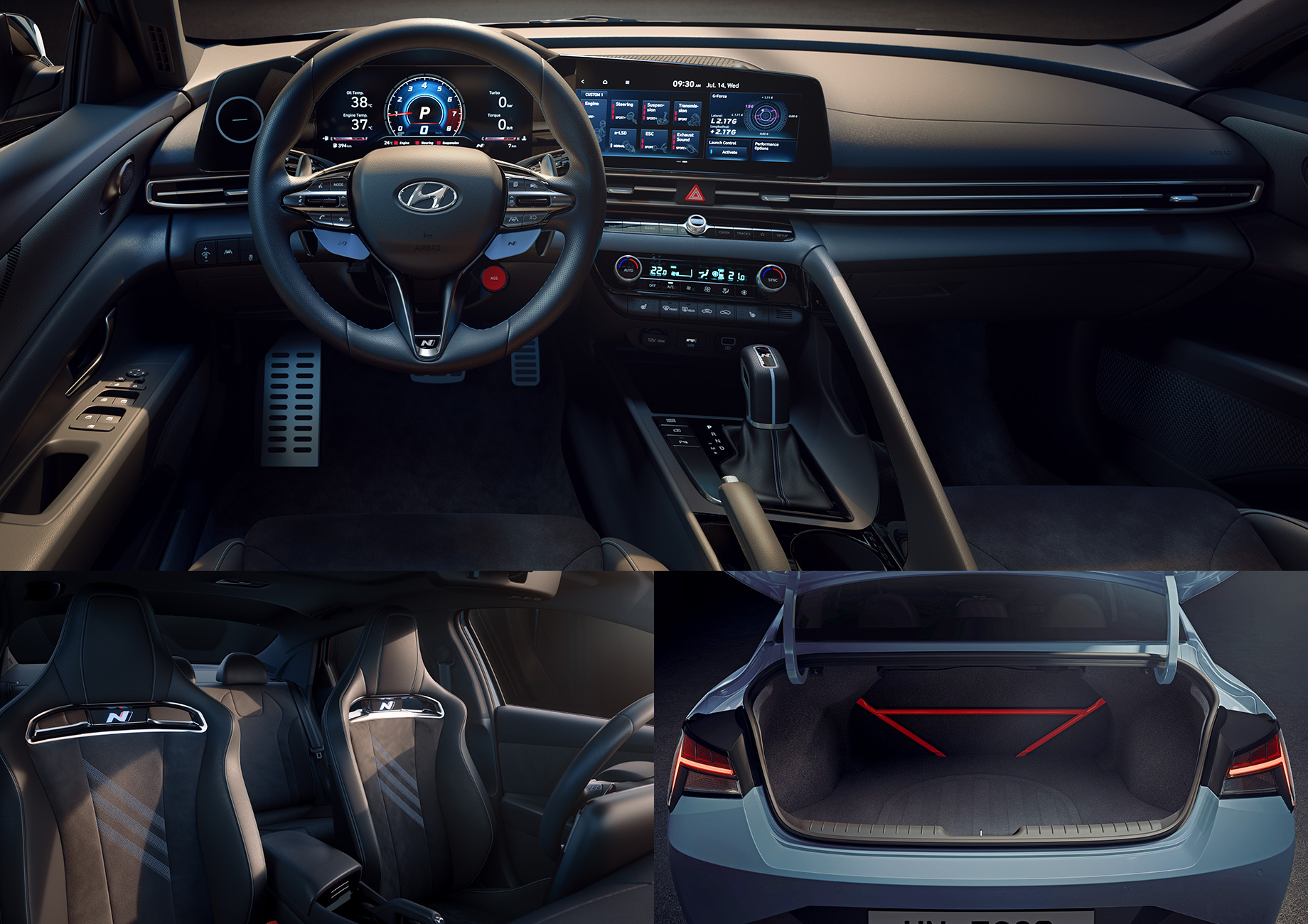 Корейцам лень перечислять все N-элементы в салоне. Назвав руль, рычаг, кресла-ковши, дверные карты и накладки на педали, они пишут «и так далее». Два дисплея по 10,25 дюйма выдают температуру масла и охлаждающей жидкости, крутящий момент, давление наддува и время круга. Телеметрия отображается на карте N Track Map. В багажнике (474 л) видны распорки для повышения жёсткости кузова.