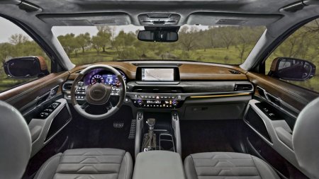 В интерьере, отделанном натуральными деревом и кожей, а также алюминием, заметны намёки на старый внедорожник Mohave, который Telluride собирается заменить. Например, рули у моделей одинаковые. Но куда больше сходства тут с салоном нового Hyundai Santa Fe.