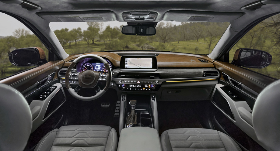 Это салон родственной Пейлисейду модели Telluride. Для сравнения. Формально кроссовер от KIA пока считается концептом, но рычаг явно никуда не сбежит, да и от центрального дисплея поползновений ждать не стоит. Архитектура интерьера у флагманов Hyundai и KIA по большому счёту одинаковая.