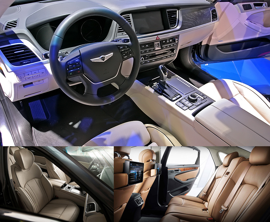 Корейский седан не производит особого впечатления в начальных исполнениях, но в дорогих комплектациях присутствуют вентилируемые сиденья, камеры кругового обзора, проектор информации на лобовое стекло, мультимедийный комплекс с DVD-проигрывателем и двумя мониторами для пассажиров второго ряда и аудиосистемой Lexicon (900 Вт, 17 динамиков), пульт управления электроприводами заднего сиденья, встроенный в центральный подлокотник дивана.
