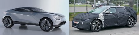 Последними EV-концептами бренда были HabaNiro, Imagine by Kia и Futuron (слева). Но фотошпионам пока попадался только один прототип (справа) глобальной модели CV. Она исповедует новую философию дизайна: «Это прогресс, разнообразие и богатая композиция контрастных элементов».