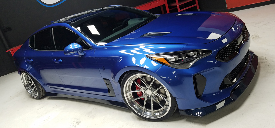 Подвески шоу-кара Stinger GT Wide Body занижены спереди на 36 мм, а сзади на 30 мм. Украшен автомобиль 21-дюймовыми коваными дисками Keen.