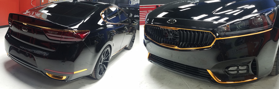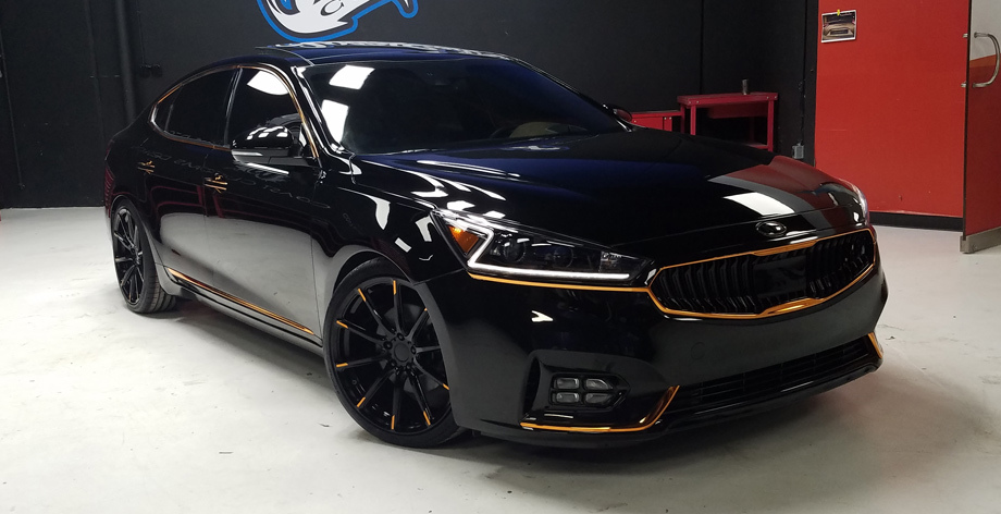 Компания West Coast Customs прошлась и по интерьеру синего Стингера, отрядив ему кожаную отделку кресел такого же цвета, серую кожу на приборной панели и алькантару на руле плюс чёрный глянец на центральной консоли. Но вот где чёрного глянца действительно вдоволь, так это в седане Kia Cadenza Obsidian, тоже построенном силами West Coast Customs.
