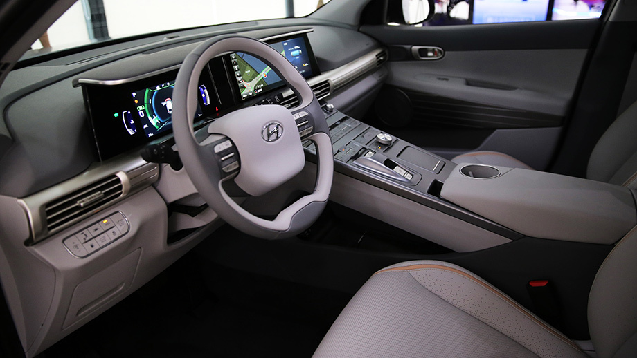 В отличие от седана Toyota Mirai, салон водородника Hyundai кажется перегруженным. Хотя тут два больших дисплея, физических кнопок хватает с избытком. Двухспицевый руль выглядит интересно, как и широченная центральная консоль. В отделке использованы биоматериалы, сочетание ткани и замши.