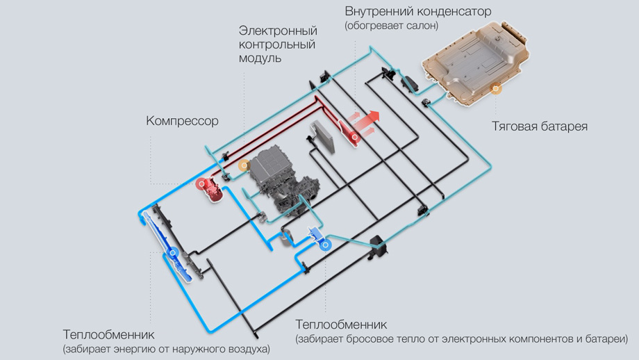 Совместная разработка Hyundai и KIA, вероятно, одна из самых развитых. В простых тепловых насосах на пользу задействовано лишь тепло от внешней среды (воздуха). В более сложных— ещё и от электромотора, батарей и силовой электроники. В последней версии системы от корейского производителя бросовым теплом с салоном делится и тяговая батарея (с жидкостным охлаждением), и инверторы, и бортовое зарядное устройство.