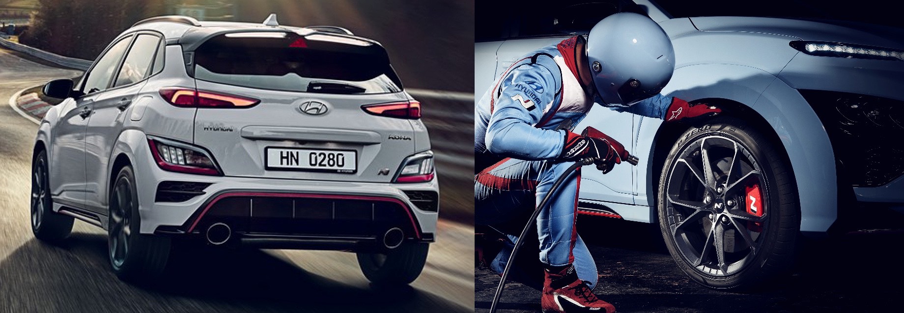 Сзади Kona N выглядит ещё злее, благодаря крупным выпускным патрубкам и двойному спойлеру с треугольным стоп-сигналом. Колёса обуты в шины Pirelli P-Zero размерностью 235/40 R19. Тормоза — с более крупными суппортами и роторами, по сравнению с менее мощными Конами.