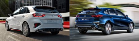 У Сида подоконник ровный. Справа показан брат-близнец — новый хэтч Kia K3 GT для Кореи. У него линия загнутая, но не повторяющая изгиб в прототипе на шпионских снимках.