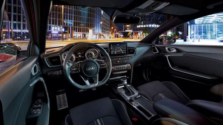 В Просиде чёрный потолок, D-образный руль идёт «в базе». Отделка сидений синтетической кожей и замшей с контрастной прострочкой в исполнениях GT Line и GT, конечно, разная. Боковая поддержка тоже. В остальном это типичный для новых Сидов салон.