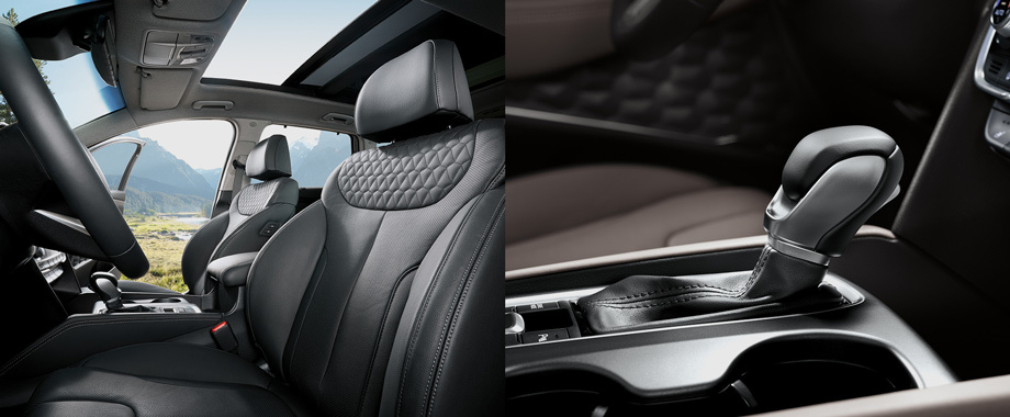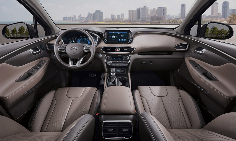 Корейцы сдвинули блок стеклоподъёмников и дверные поручни вперёд, чтобы высвободить больше пространства под локти пассажиров, и уменьшили объём дверных карманов ради большего простора для ног. В дорогих версиях Santa Fe щеголяет кожаной отделкой передней панели, мультимедийным комплексом с навигацией и камерами кругового обзора.