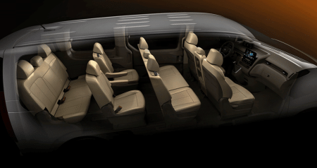 Архитектурой передней панели Staria напоминает Tucson последнего поколения, но иначе расположены дисплей цифровой приборной панели и особенно центральный тачскрин на 10,25 дюйма, который объединён с сенсорным блоком управления климат-контролем. Staria будет доступна в двух исполнениях — базовом (серебристая машина) и дорогом Premium. Топ-версия выделяется оригинальной решёткой радиатора, чёрным декором кузова и 18-дюймовыми колёсами с необычным дизайном. У таких машин будет полностью светодиодная головная оптика и пиксельные задние фонари, простирающиеся тонкой полосой от бампера до крыши.