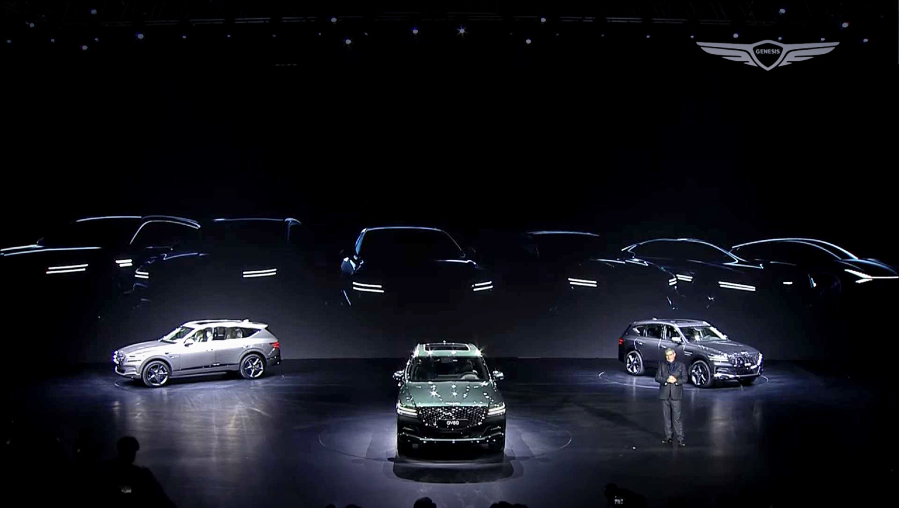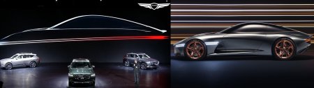 Марка Genesis использовала премьеру своего первого кроссовера GV80, чтобы намекнуть на грядущие модели. Присутствовавшие в зале журналисты не без труда распознали все шесть автомобилей, продемонстрированных в темноте с «двухполосной» оптикой. Ими (вроде бы) оказались кроссоверы GV80 и GV70 (прежде невиданный), седаны G70 (обновлённый) и G80 (второго поколения), серийные версии концептов Essentia и Mint. Отсутствие четырёхдверки G90 настораживает...