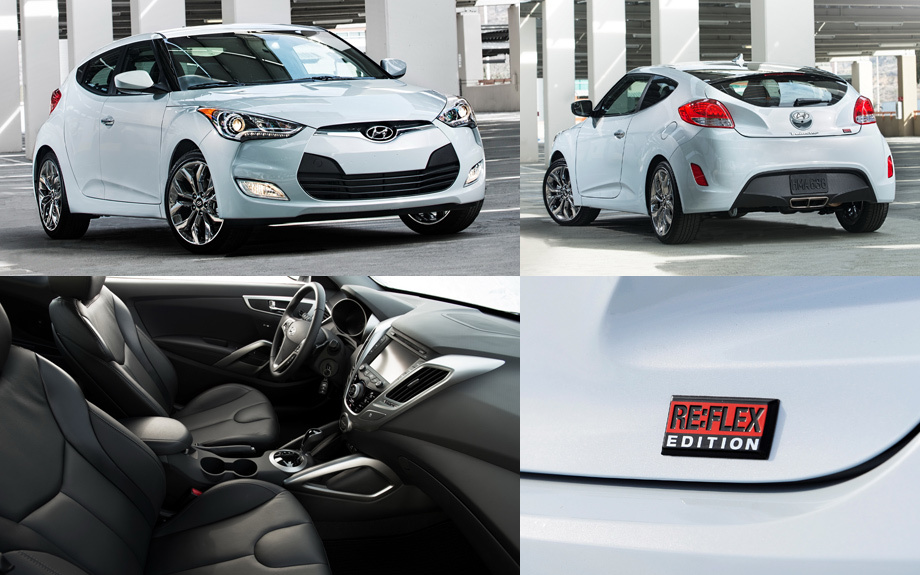 Последнее упражнение дизайнеров с Велостером — модель RE:FLEX Edition, показанная на автошоу в Чикаго в феврале нынешнего года. Изменений вообще-то минимум: светодиодная оптика, больше хрома в отделке, оригинальные 18-дюймовые колёсные диски. В салоне — подсветка порогов, специальные коврики с вышитым названием спец серии да кожаные кресла чёрного либо красного цвета (на выбор). Комплектуется такой автомобиль обычным мотором 1.6 (132 л.с.) и шестиступенчатым «роботом». Veloster RE:FLEX Edition выпустят в количестве трёх тысяч штук, продавать будут только в США.
