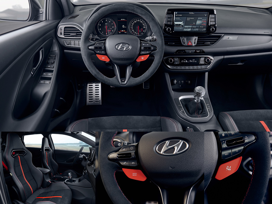 Разница в массе в полцентнера, в сравнении с простым i30 N, очевидно, посчитана исходя из подобной комплектации машин. Ведь у хот-хэтча i30 N Performance масса с набором опций может достигать 1509 кг, а в таком случае дельта составляет уже 114 кг — существенное число по меркам сегмента С. Добиться такого показателя позволил первый на дорожных моделях Hyundai углепластик CFRP в кузове (из него сделаны сплиттер, диффузор, капот и пороги). Только капот сэкономил 7,2 кг. Из углепластика сделана также основа спортивных кресел Sabelt (каждое на 7,5 кг легче штатного). Ещё 22 кг помогли сэкономить 19-дюймовые кованые колёсные диски OZ (размерность шин — 235/35 R19).
