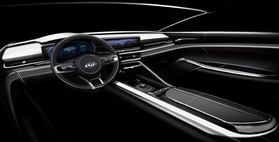 Хоть перед нами ещё лишь эскиз, уже видно: интерьер в этом поколении явно повзрослел и стал чище — уменьшилось число кнопок, селектор трансмиссии ужался от «кочерги» до вращающейся шайбы, а центральный экран существенно вырос в размерах.