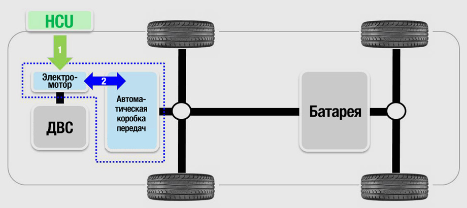 Блок HCU использует софт с «новой логикой», чтобы прецизионно управлять электромотором (действие обозначено 1) и через него автоматической коробкой (2).