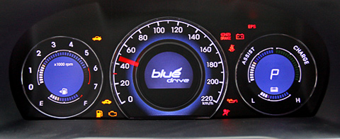 Приборная панель помимо всего прочего отображает степень отдачи электромотора при разгоне и уровень подзарядки батареи при торможении.