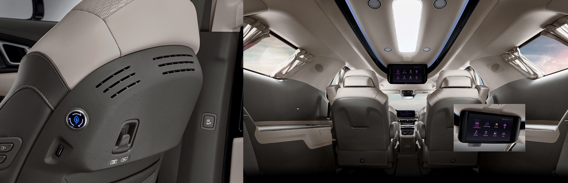По сравнению со стандартной версией машины пространство над головами пассажиров увеличилось на 291 мм. В спинках передних кресел предусмотрены очистители воздуха, на потолке — монитор диагональю 21,5 дюйма с возможностью «зеркалить» медиаустройства.